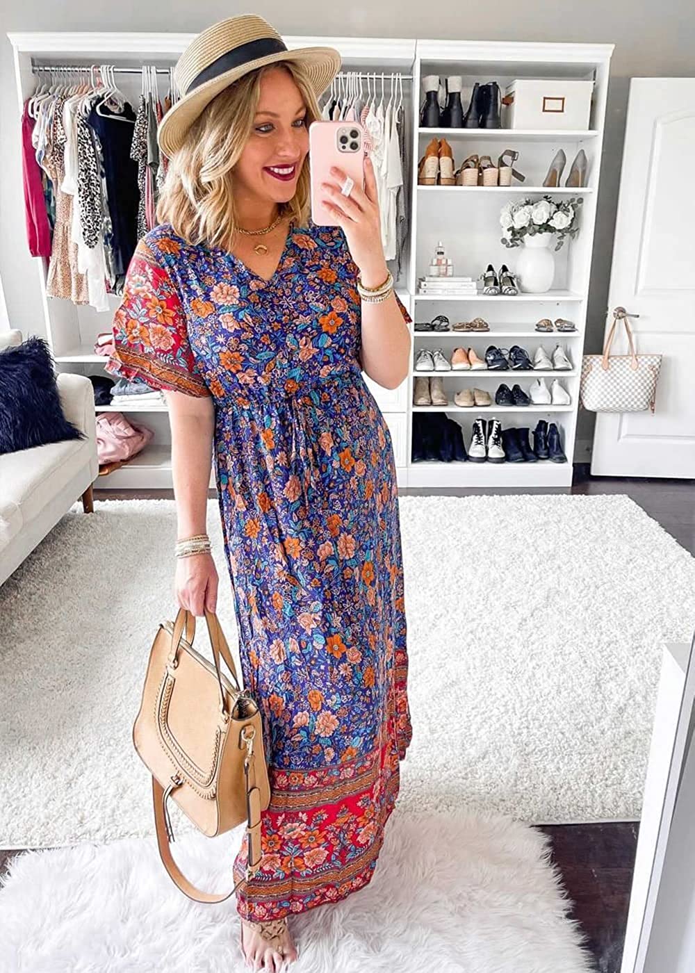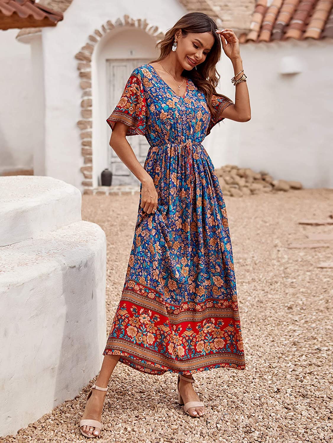 Women's Casual Floral Print V Neck Short Sleeve Summer Boho Beach Dress High Waist Long Maxi Dresses