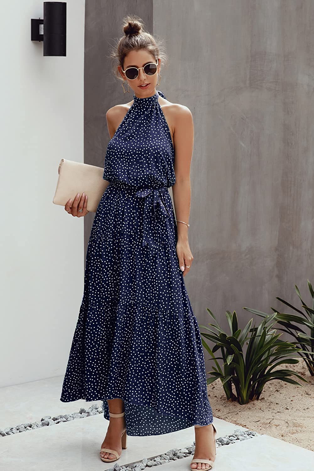 Women's Casual Halter Neck Sleeveless Floral Long Maxi Dress Backless Loose Ruffle Sundress with Belt