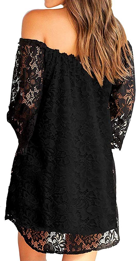 Women's Casual Off Shoulder Lace Shift Loose Mini Dress with 3/4 Sleeve