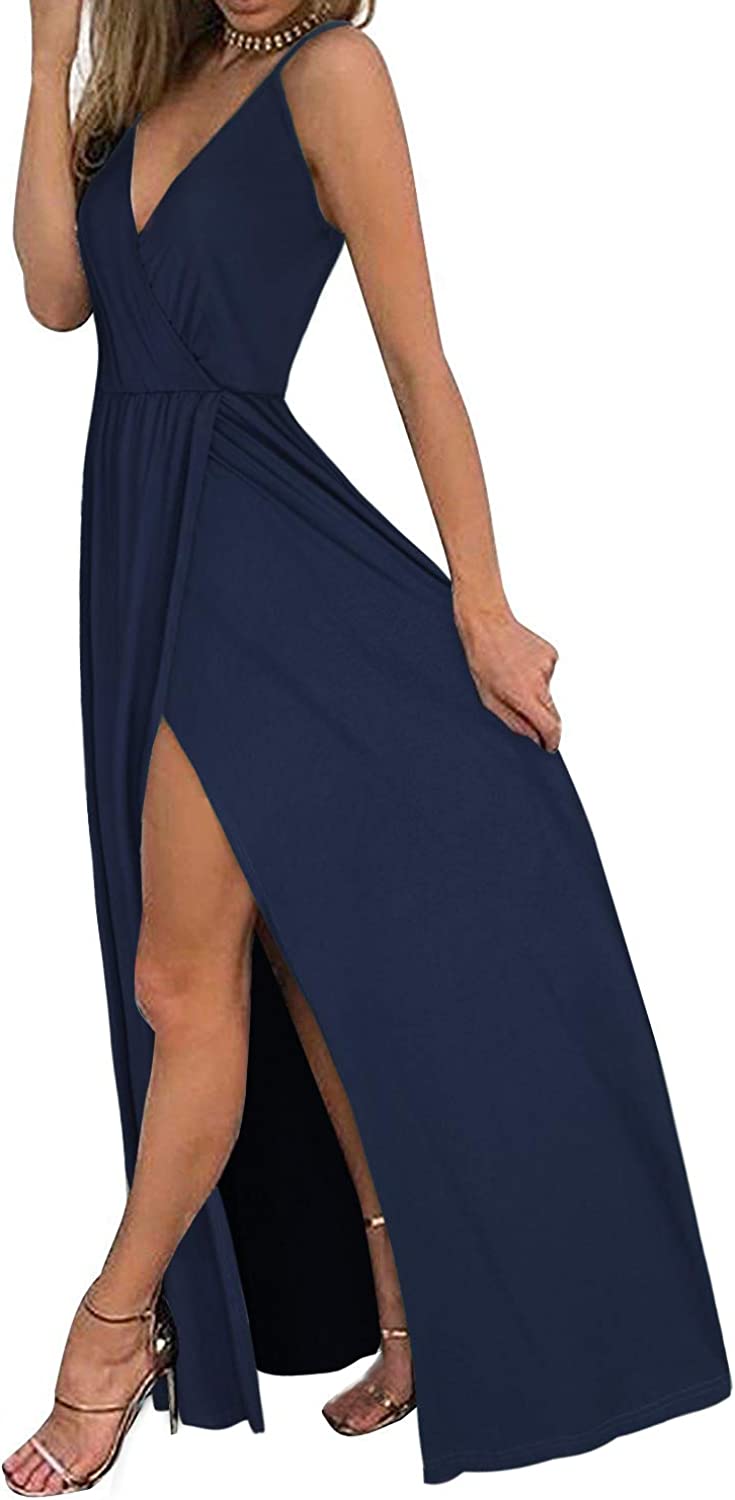 Women's Deep V-Neck Casual Dress Summer Backless Floral Print/Solid Split Maxi Dress for Beach Party