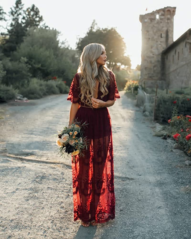 Women's Deep V-Neck Lace Romper Short Sleeve Long Dress