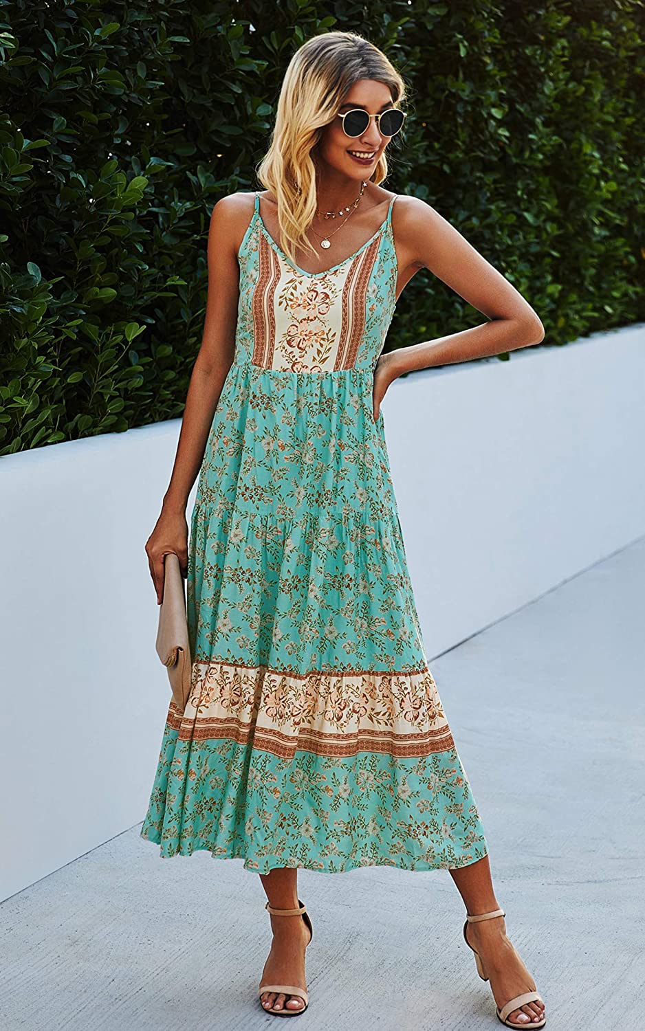 Women's Dresses Floral Adjustable Spaghetti Strap V Neck Boho Long Maxi Dress Summer Beach Flowy Ethnic Sundress