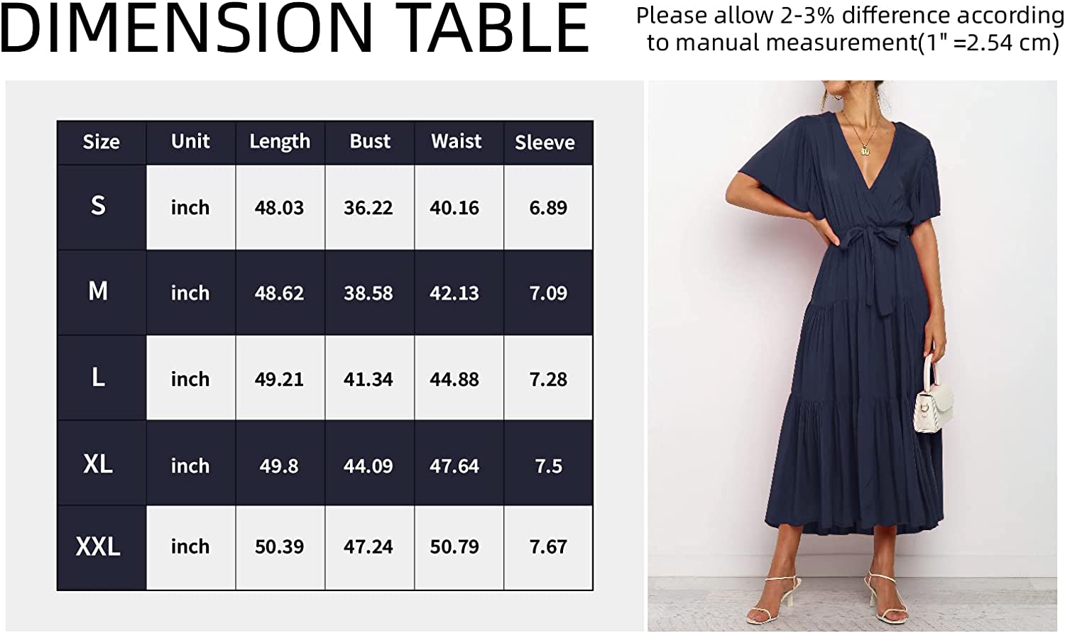 Women's Maxi Dress Summer Short Sleeve Chiffon Dresses Casual V Neck Tie Waist Formal Dress