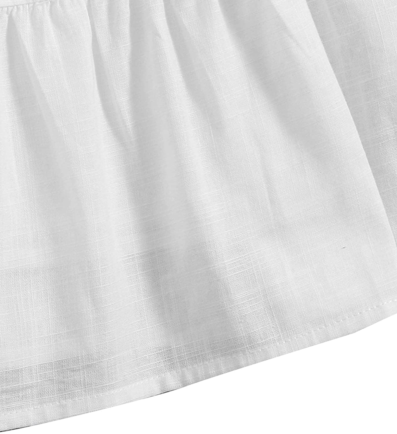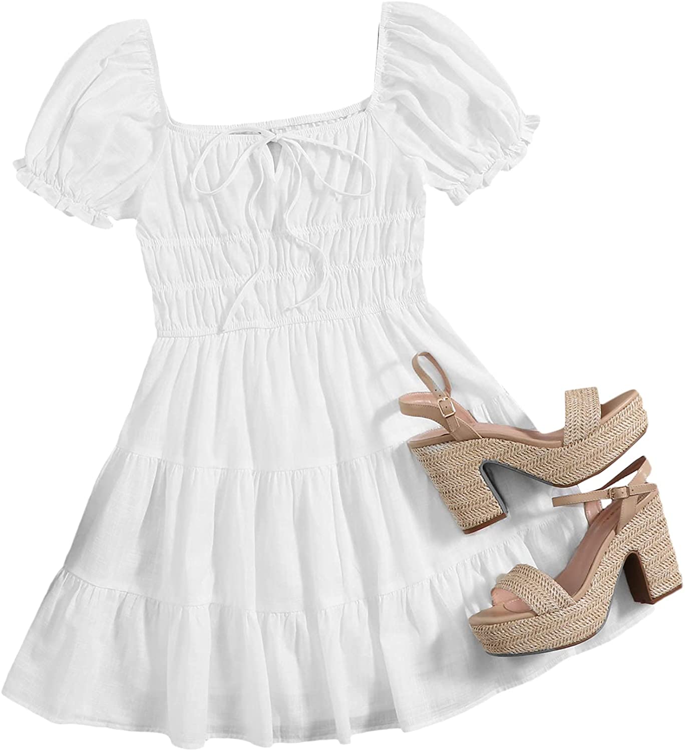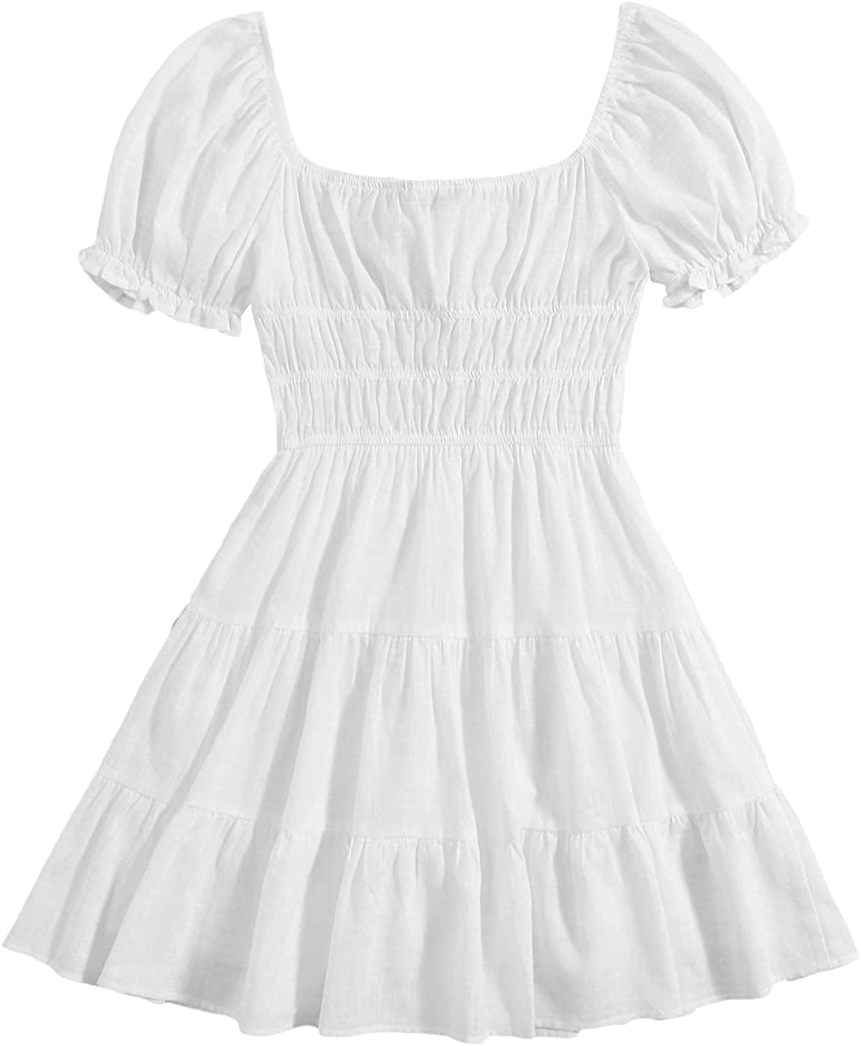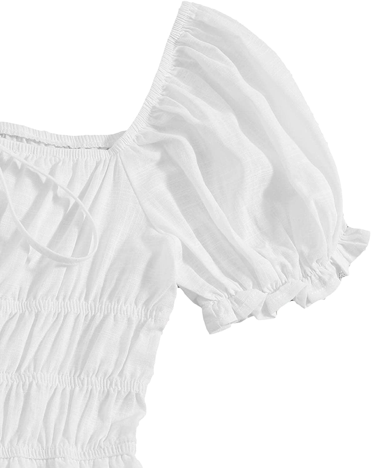 Women's Short Puff Sleeve Ruched Mini A Line Dress Ruffle Tie Front Square Neck Short Dresses