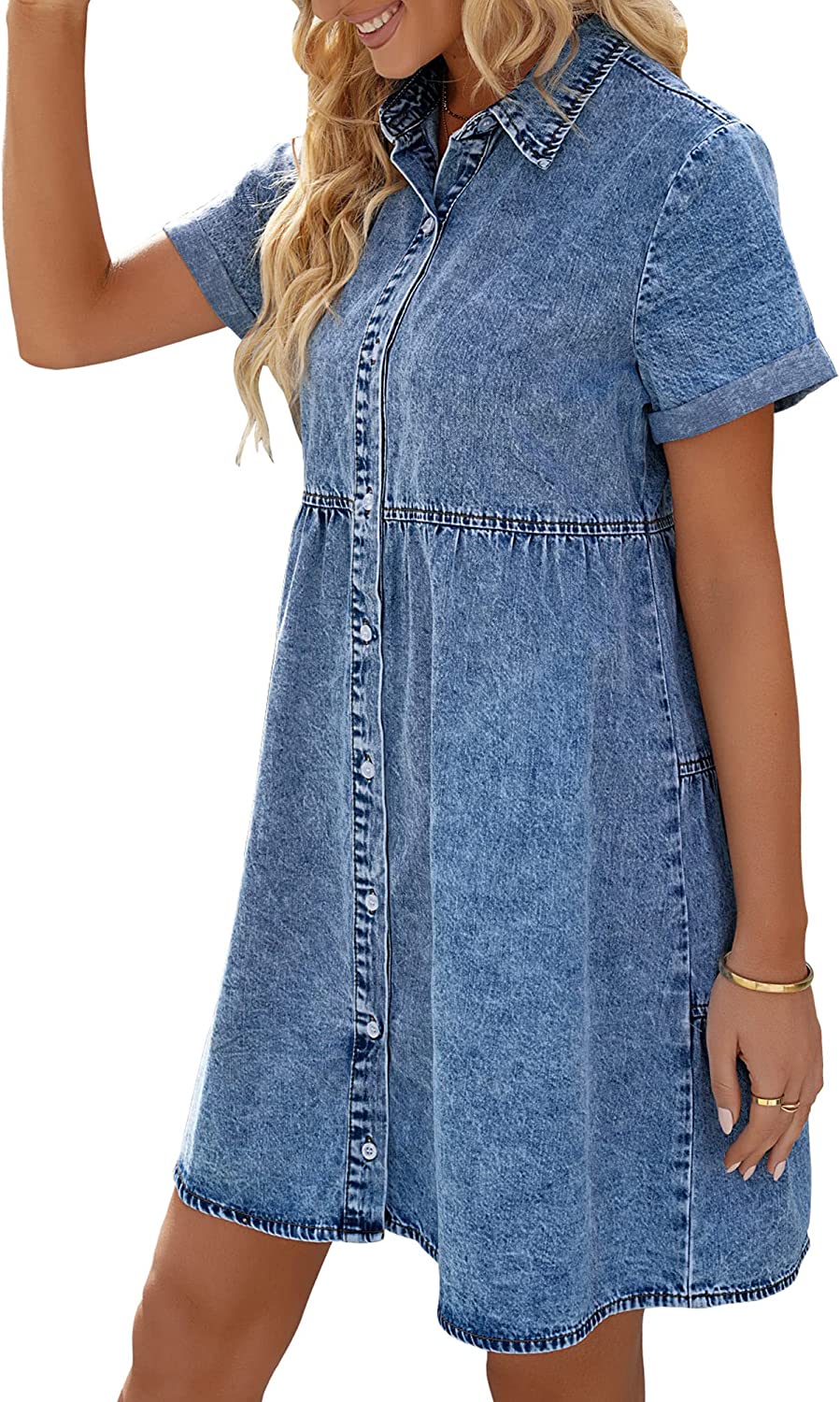 Women's Short Sleeve Button Down Flowy Tiered Babydoll Denim Dress