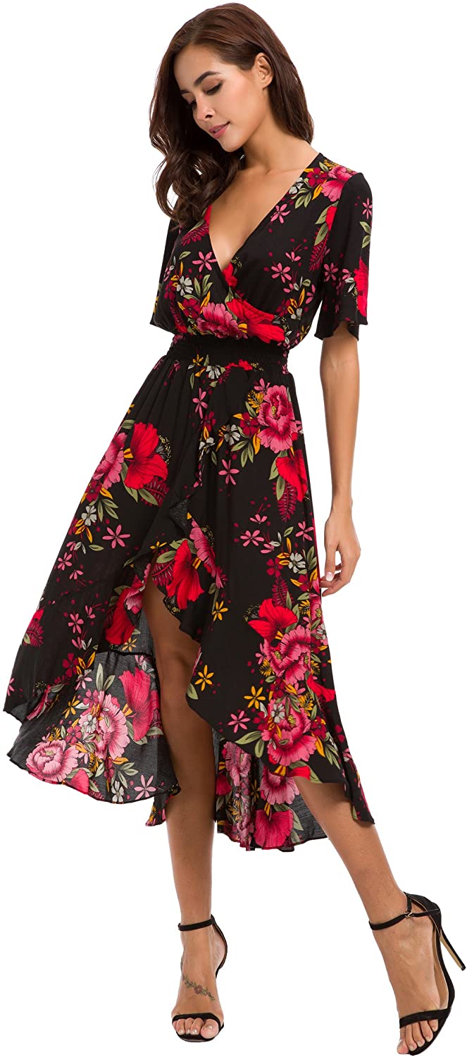 Womens Short Sleeve Floral High Low V-Neck Flowy Party Long Maxi Dress