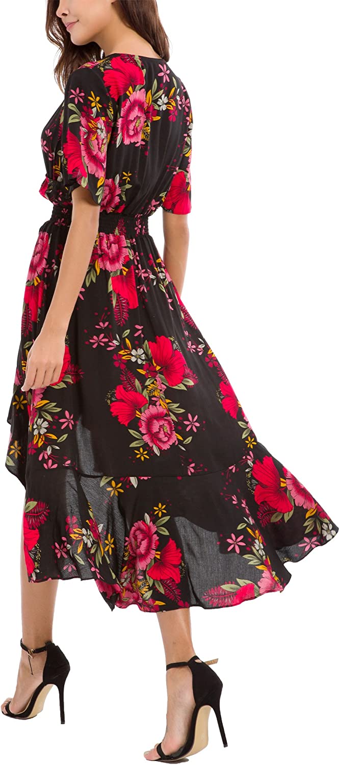 Womens Short Sleeve Floral High Low V-Neck Flowy Party Long Maxi Dress