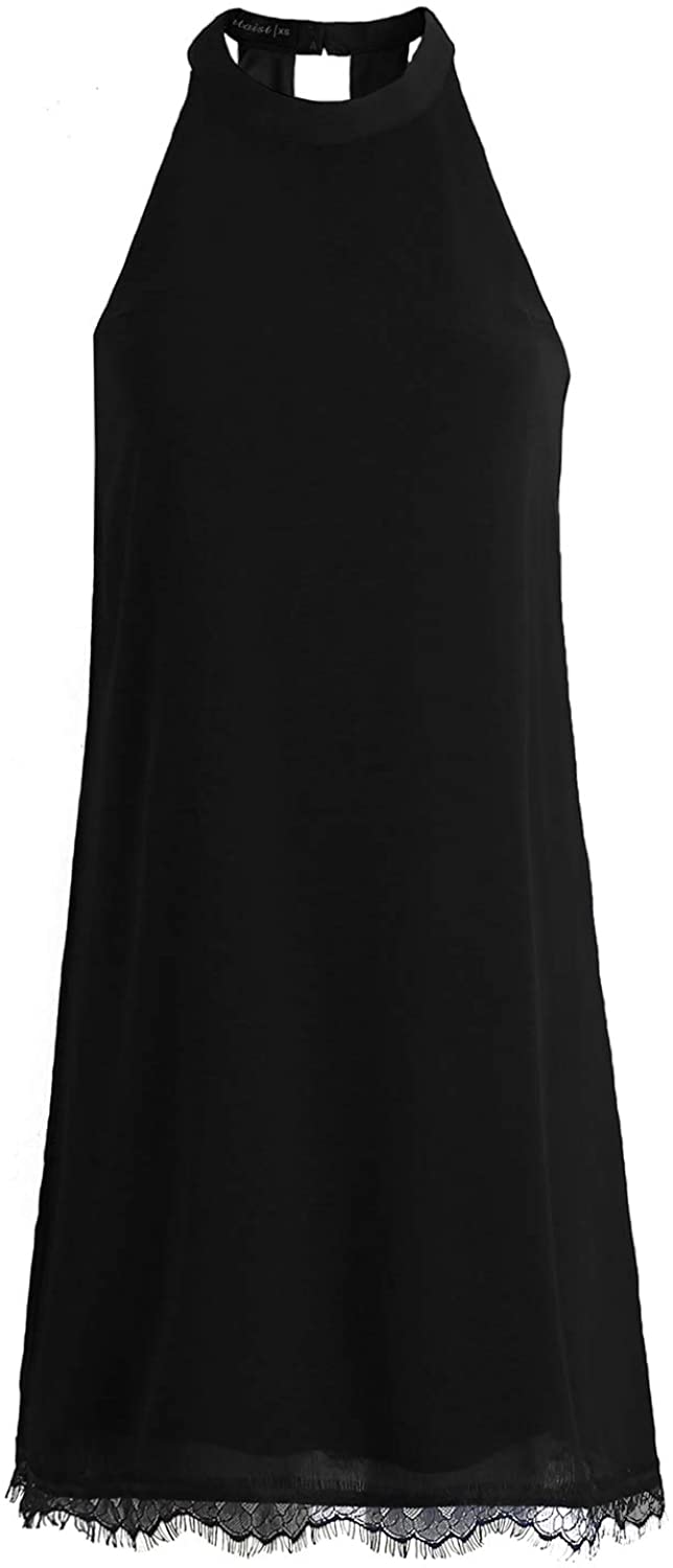 Women's Sleeveless Halter Neck Patchwork Lace Mini Casual Shift Dress