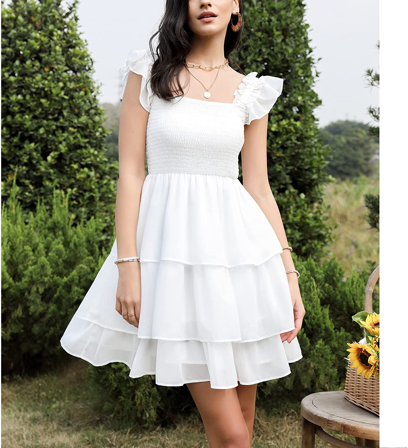 Womens Square Neck Sleeveless Ruffle Dress High Waist Backless Tiered Smocked Strappy Casual Short Mini Dresses