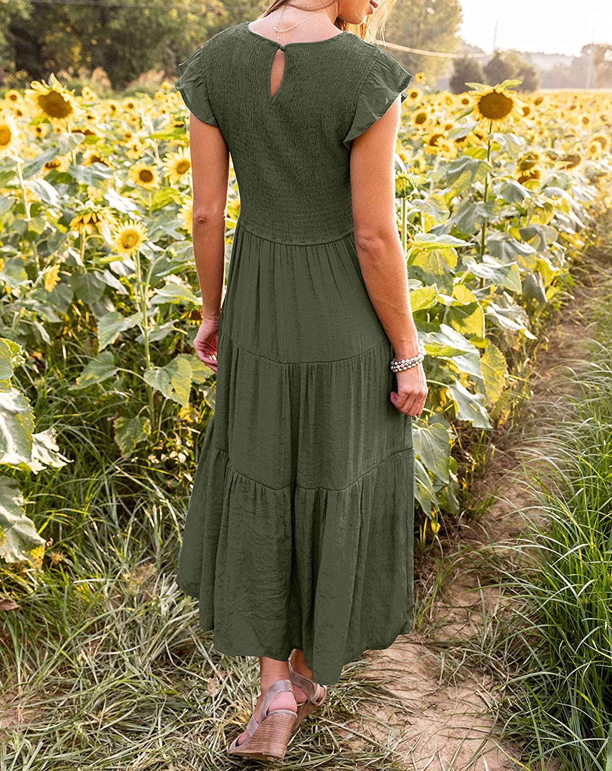 Women's Summer Casual Flutter Short Sleeve Crew Neck Smocked Elastic Waist Tiered Midi Dress