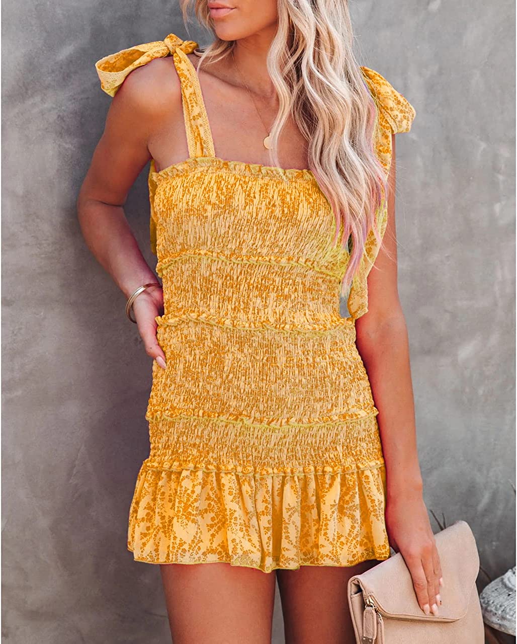 Women's Summer Floral Square Neck Spaghetti Strap Ruffle Tie Mini Smocked Dress