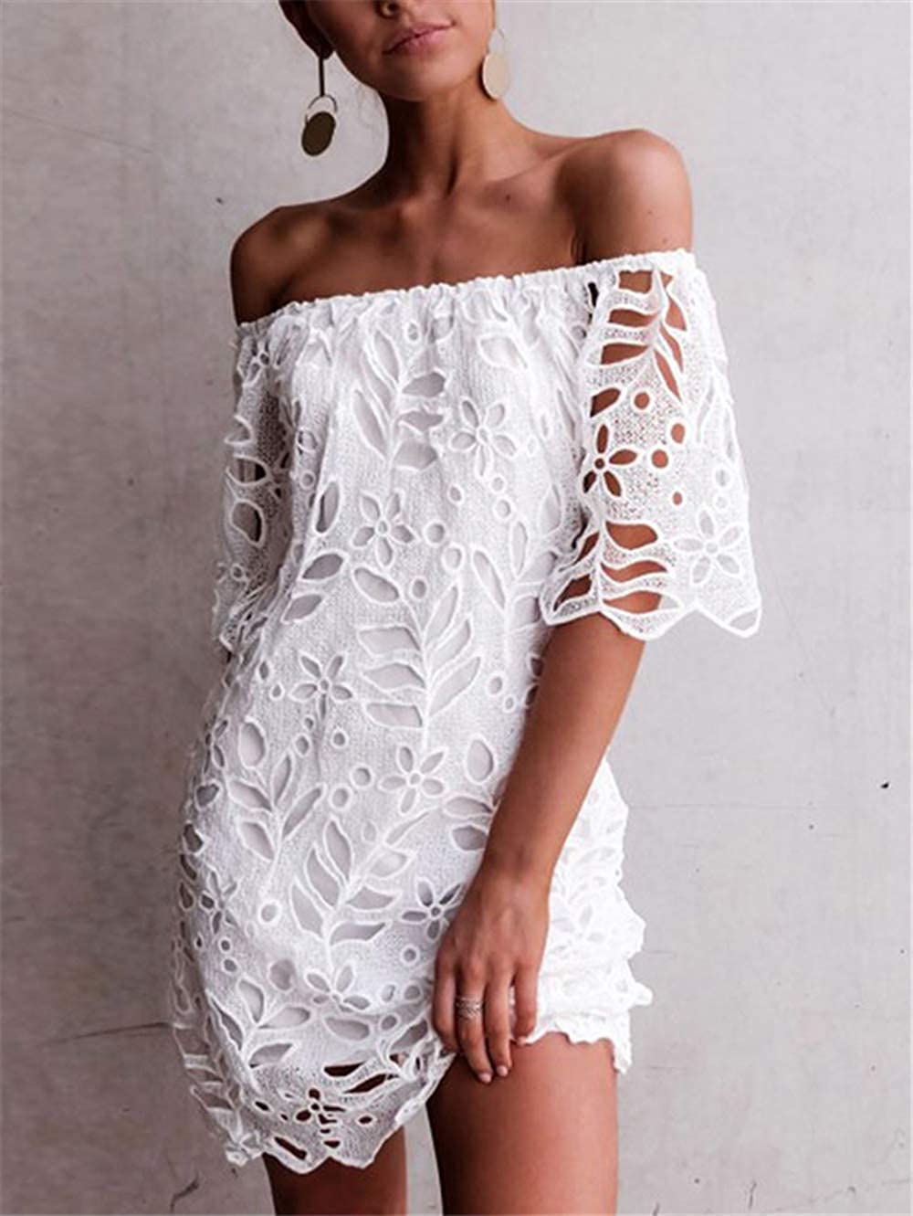 Women's Summer Off Shoulder Vintage Floral Lace Flare Short Sleeve Loose Elegant Mini Dress