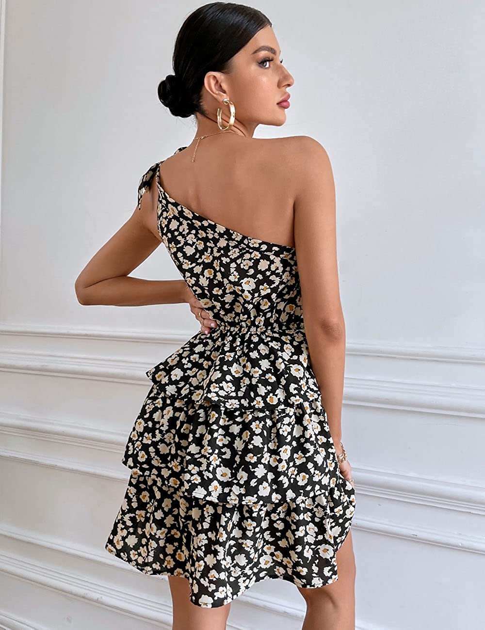 Women's Summer Tie One Shoulder Boho Floral Dress Elastic Waist Tiered Ruffle A Line Flowy Mini Dresses